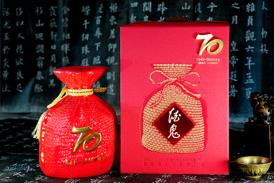 “酒鬼酒70周年纪念酒”延续大单品新红坛的红色瓶身和黄色麻绳主基调,艺术抽象的70年Logo为元素,生动自然,以此来表达对祖国的崇敬之意,相互辉映,引人入胜,把纪念酒的含义推向极致。大红国瓷瓶体,真金烤花工艺,兼有实用和艺术的双重价值,是收藏与赠友的珍品。酒瓶容积为700ml,寓意共和国70年历程。