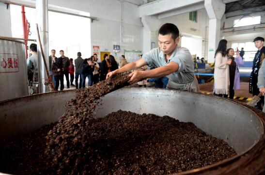 图说:酿酒工人正在上甑