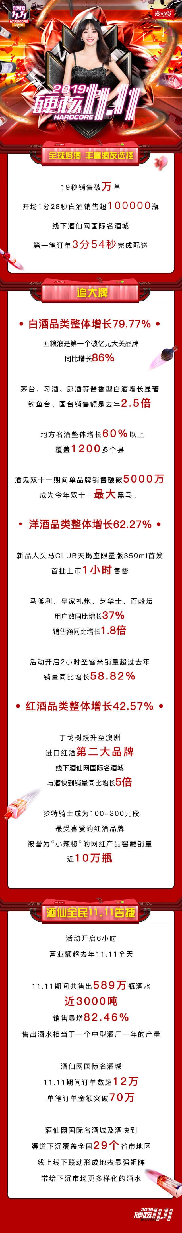 战报显示:酒仙网硬核双十一活动开始19秒销售破万单,开场1分28秒白酒销售超10万瓶,活动开启6小时,营业额便超去年11.11全天,线下酒仙网国际名酒城第一笔订单3分54秒完成配送。