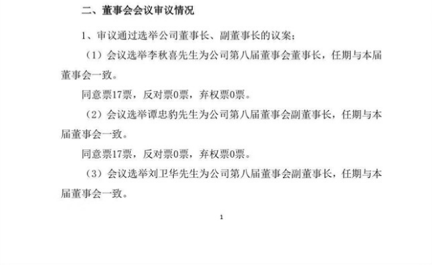 会议选举李秋喜先生为公司第八届董事会董事长,任期与本届董事会一致。其中,同意票17票,反对票0票,弃权票0票。