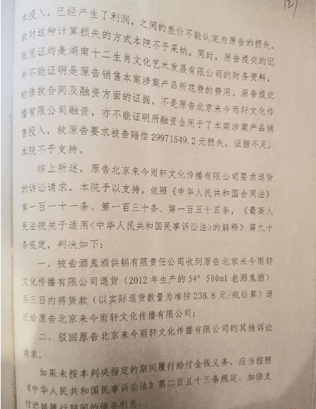 2019年4月,湘西州中院作出判决,酒鬼酒供销公司收到来今雨轩公司退货后3日内将货款退还,并驳回来今雨轩公司其他诉讼请求。