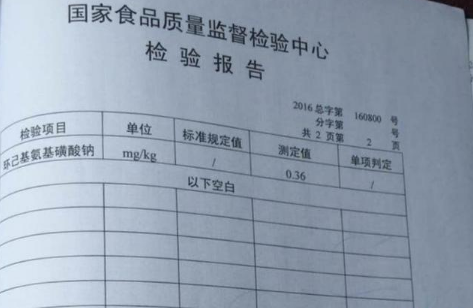 红星新闻记者从石磊处获取了前述3份检验报告。国锦(上海)检测技术有限公司2016年5月23日《检验报告》显示,送检样品白酒中的甜蜜素测定值为0.384mg/L;国家食品质量监督检验中心2016年8月3日《检验报告》显示,甜蜜素测定值为0.36mg/kg;国家食品质量监督检验中心2019年8月29日《检验报告》显示,甜蜜素测定值为0.344 mg/kg。