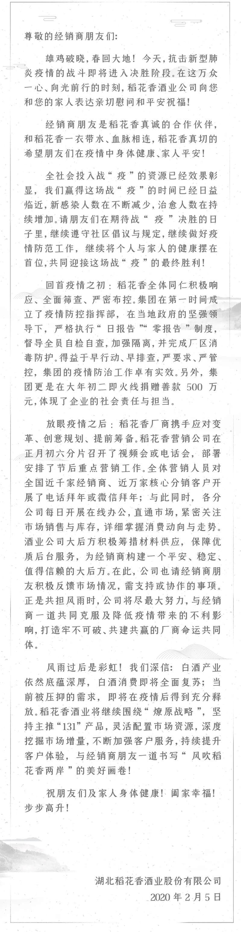 酒鬼酒股份有限公司则早在1月31日即发出了致经销商的信。信中表示:大疫无情人有情,向合作伙伴朋友们致以诚挚的慰问!向各位伙伴在疫情严峻的关键时刻仍然与酒鬼酒并肩战斗表示衷心的感谢!企业深知,合作伙伴朋友们也处于抗击新冠肺炎的一线,积极调控资源应对疫情,给予员工兄弟以安抚,承担着市场动销和库存周转的压力,当前最紧迫的任务就是坚决打贏疫情防控阻击战,以尽快恢复正常经济秩序,实现市场良性运转。信中还透露,正在抓紧研究,疫情期间及之后一个阶段恢复和发展业务的具体举措,在此过程中将会与合作伙伴朋友们保持密切沟通,深入了解商家面临的问题和困难,共同探寻解决方案,将始终同合作伙伴朋友们站在一起,手牵手,肩并肩,同呼吸,共命运,并期待加深互信共赢,共同迎来发展新局面。