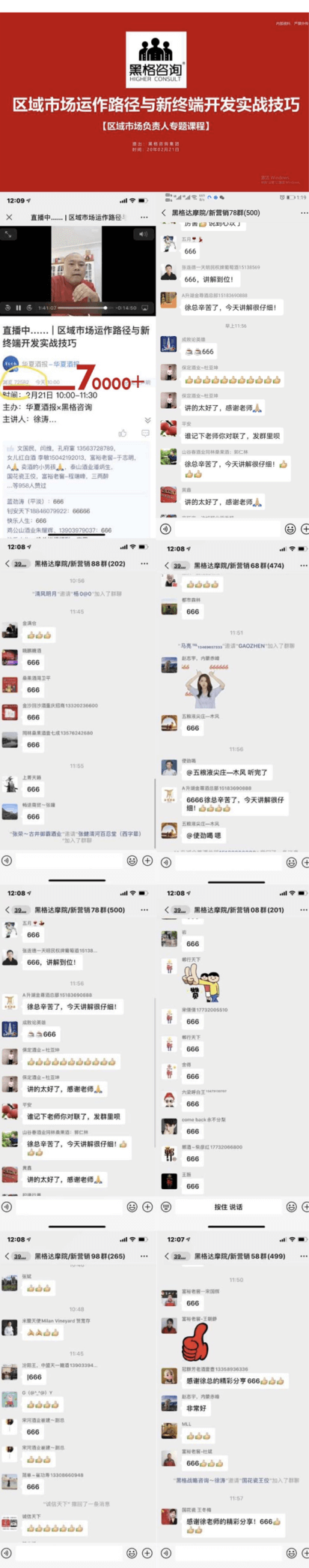 2月21日,2020年疫情下的中国酒业营销实战系列云课堂第五集开播,黑格咨询总经理徐涛带来《区域市场运作路径与新终端开发实战技巧》,区域负责人的思维模型、区域市场运作的三大路径,六大招式,三大渠道在疫情恢复期如何做?当这本线上销售宝典一经“展开”,学员们踊跃“取经”,当日创造了7万人的观看学习的记录,可见一线市场对酒类终端开发运作经验的渴求,已经到了一个高位。