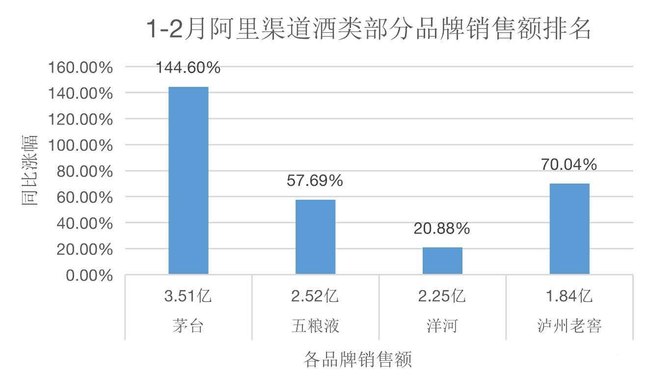 从线上电商平台来看,高端白酒增长强劲。2020年1~2月,阿里巴巴国产白酒线上销售额20.39亿元,同比增长58.41%,销售量506.81万件,同降5.06%,均价402.26元,同比增长66.86%;其中贵州茅台销售额3.51亿元,同比增长144.60%,位居行业首位;五粮液销售额2.52亿元,同比增长57.69%;洋河销售额2.25亿元,同比增长20.88%;泸州老窖销售额1.84亿元,同比增长70.04%,增长速度仅次于茅台。