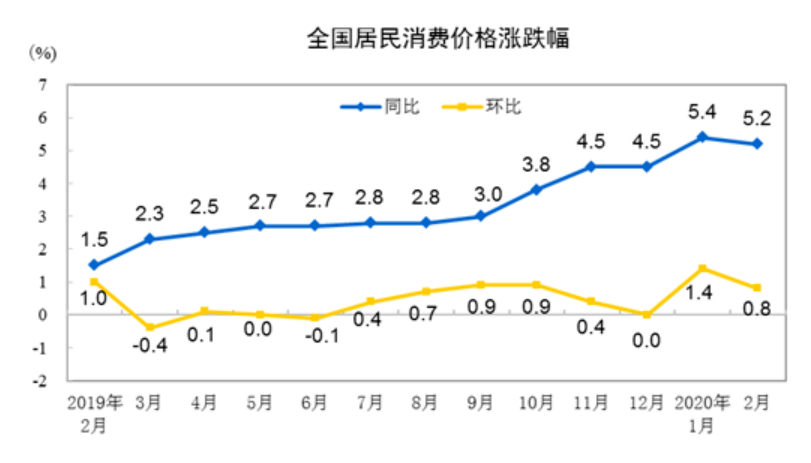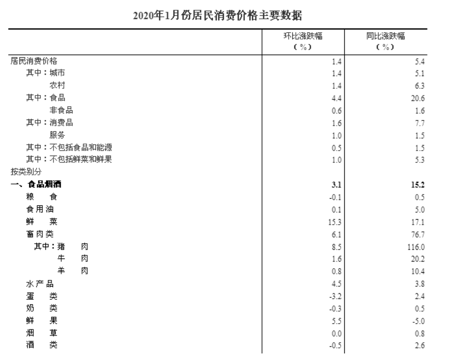 2020年1月份,全国居民消费价格同比上涨5.4%。其中,城市上涨5.1%,农村上涨6.3%;食品价格同比上涨20.6%,非食品价格上涨1.6%;消费品价格同比上涨7.7%,服务价格上涨1.5%。从分类看,食品烟酒类为主,价格同比上涨15.2%,影响CPI(居民消费价格指数)上涨约4.52个百分点;