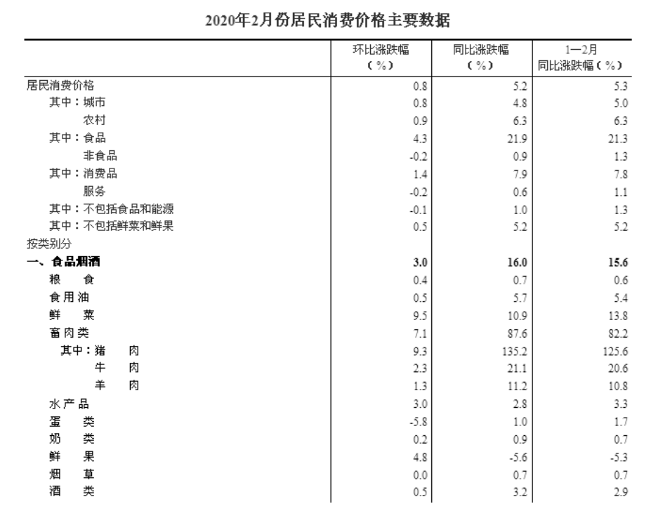 再看2月份,全国居民消费价格同比上涨5.2%,其中食品价格同比上涨21.9%,非食品价格上涨0.9%;消费品价格同比上涨7.9%,服务价格上涨0.6%。1-2月平均,全国居民消费价格比去年同期上涨5.3%。按分类统计,食品烟酒类价格同比上涨16.0%,影响CPI(居民消费价格指数)上涨约4.84个百分点;