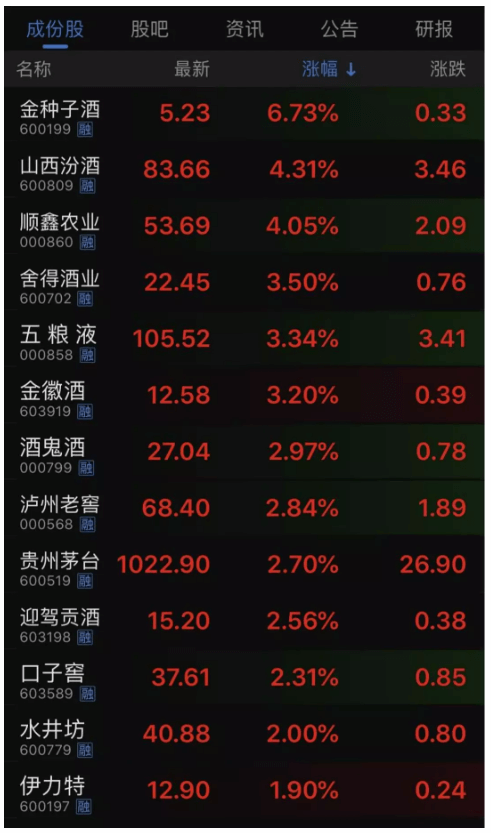白酒板块今日拉升走高,金种子酒涨超7%,顺鑫农业、山西汾酒涨近4%,五粮液、酒鬼酒涨超3%,贵州茅台、泸州老窖等集体上涨。其中,贵州茅台重回1000元关口。