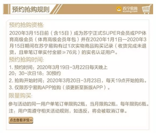 虽然茅台酒的市场价格遭遇下跌,但电商平台的平价茅台酒却依旧炙手可热。昨日,苏宁易购发布消息,自3月20日开始,将启动每天19:00飞天茅台酒的抢购活动。此前,除了春节期间的每日抢活动外,苏宁易购采用的是5~7日为周期的预约抢购模式,如今优化升级抢购规则,是抢购频率变得更高。除了苏宁易购之外,还有不少商超如沃尔玛等也改变的抢购规则,使得疫情期间的平价茅台酒更好购买。从另一方面来说,这也是它们对于消费者疫情期间消费欲望降低的一种妥协。有网友不禁调侃:“李保芳没有控制下来的茅台酒价被新冠肺炎的疫情控制下来了!”