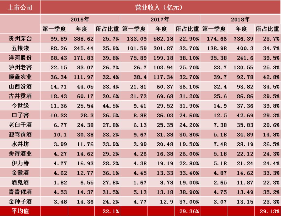 通过计算2016年、2017年、2018年这三年18家上市酒企第一季度营收在全年中的占比,我们得出一个平均数分别是32.1%、29.4%、29.1%。