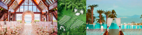 从左至右:三亚亚龙湾万豪度假酒店的“海之恋”婚礼堂、三亚海棠湾JW万豪度假酒店的椰林草坪、三亚山海天大酒店傲途格精选的玻璃水台