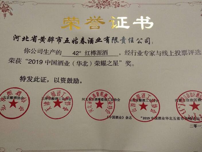 在“献礼祖国70华诞华北品牌酒水发布典礼”上,来自黄骅市五姑春酒业有限责任公司的产品“42度红樽源酒”在历经20多天线上激烈的打榜投票以及大会现场专家客观品评后,荣获“2019中国酒业(华北)荣耀之星奖”。
